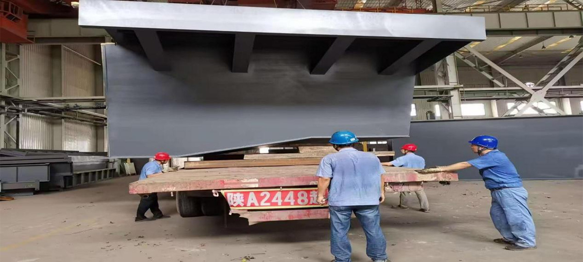 由于該項(xiàng)目鋼箱梁中的疊合梁數(shù)量較多,不僅內(nèi)部結(jié)構(gòu)復(fù)雜,而且外部形狀極不規(guī)則,裝車發(fā)運(yùn)難度較大。為此,陜重公司的運(yùn)輸公司,超前工作,在鋼箱梁的加工制作過程中,就提前深入到生產(chǎn)車間和現(xiàn)場,進(jìn)行跟蹤,全面收集、匯總、計算鋼箱梁各部位的尺寸變化,再根據(jù)運(yùn)輸?shù)能囆?,選用安全牢靠的鋼材,設(shè)計、制作運(yùn)輸工裝,并首此采取了鋼箱梁"先在廠內(nèi)試運(yùn),確認(rèn)運(yùn)輸安全后,再正式裝車發(fā)運(yùn)出廠"的安全運(yùn)輸方案,確保了400多塊鋼箱梁的正常安全運(yùn)輸。